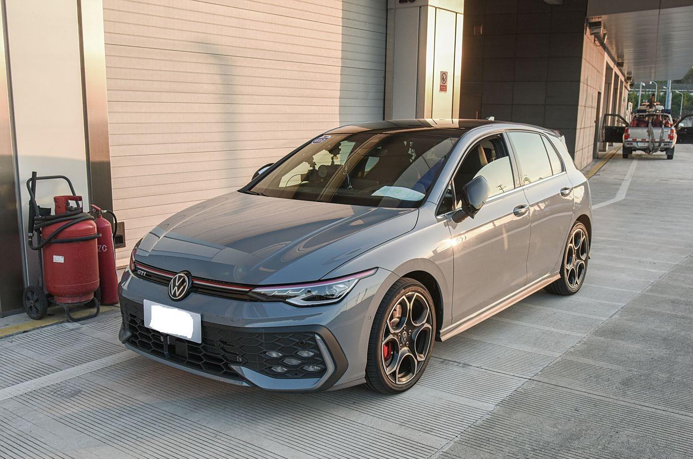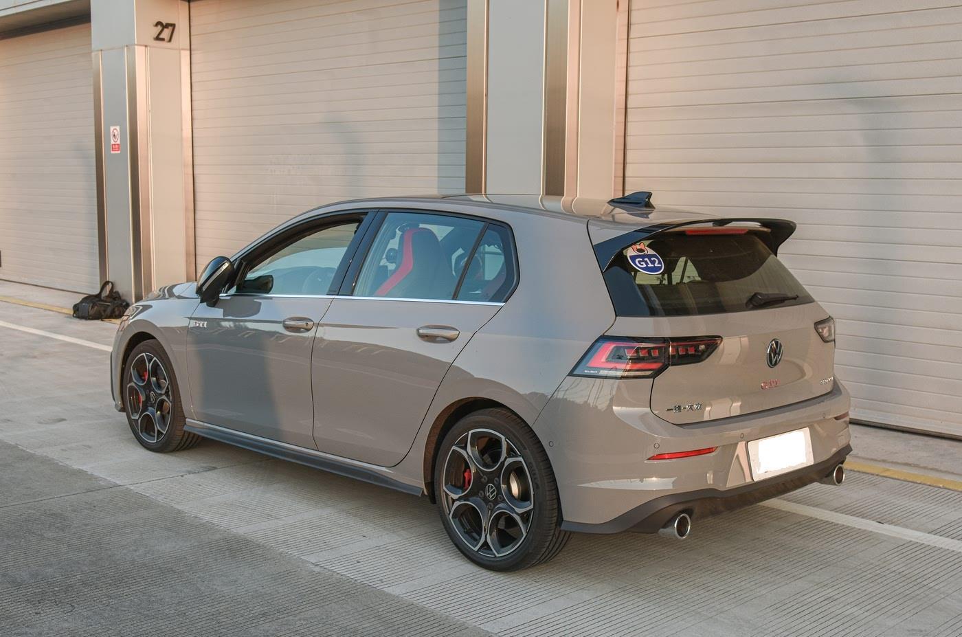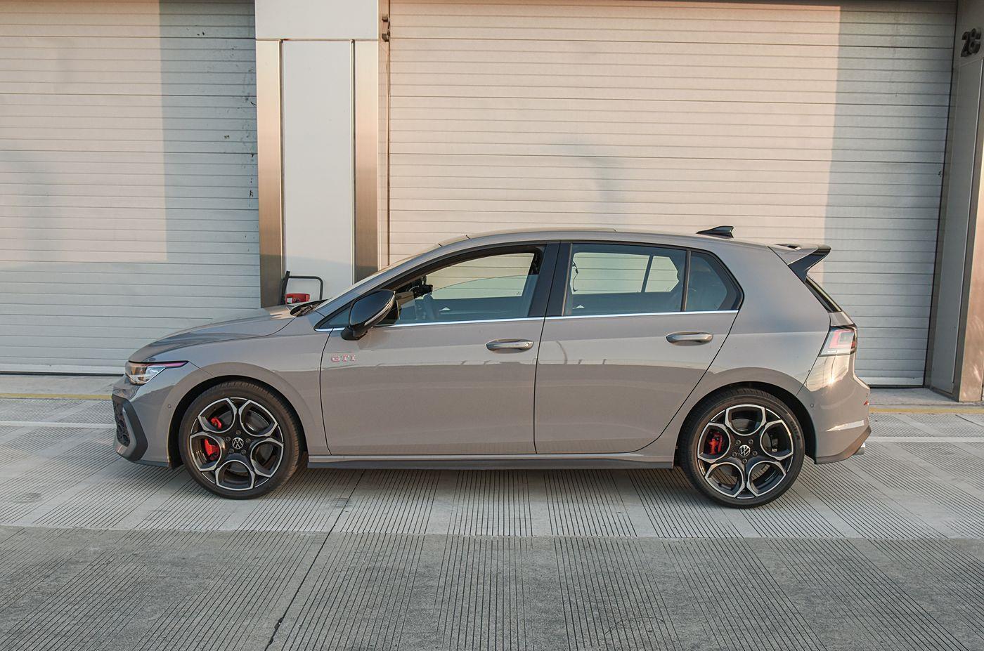 再来看车身侧面部分,车身侧面是高尔夫 GTI 的 “灵魂所在”,4296mm×1788mm×1471mm 的紧凑尺寸搭配 2631mm 轴距,塑造出 “短小精悍” 的经典两厢比例。车顶线条从 B 柱平缓下滑,配合倾斜的后挡风玻璃,既保证了头部空间,又营造出轿跑般的灵动姿态。而车窗下沿的镀铬饰条与黑色外后视镜形成撞色对比,C 柱位置的 “GTI” 侧标则是向经典致敬的细节。车身侧面的内凹式腰线从车头延伸至车尾,在光影下勾勒出肌肉感十足的轮廓,配合黑色侧裙,进一步降低视觉重心。