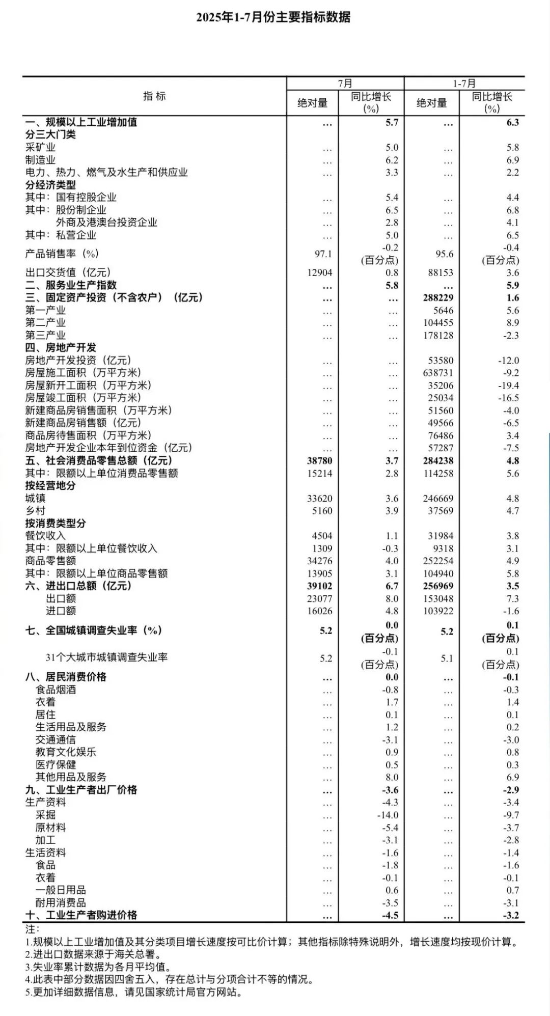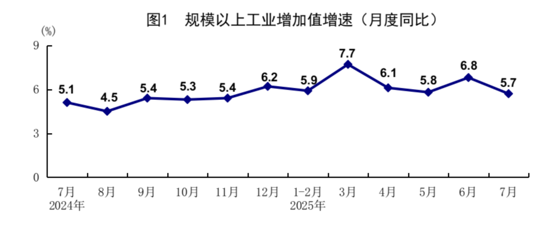7月份,全国规模以上工业增加值同比增长5.7%,环比增长0.38%。