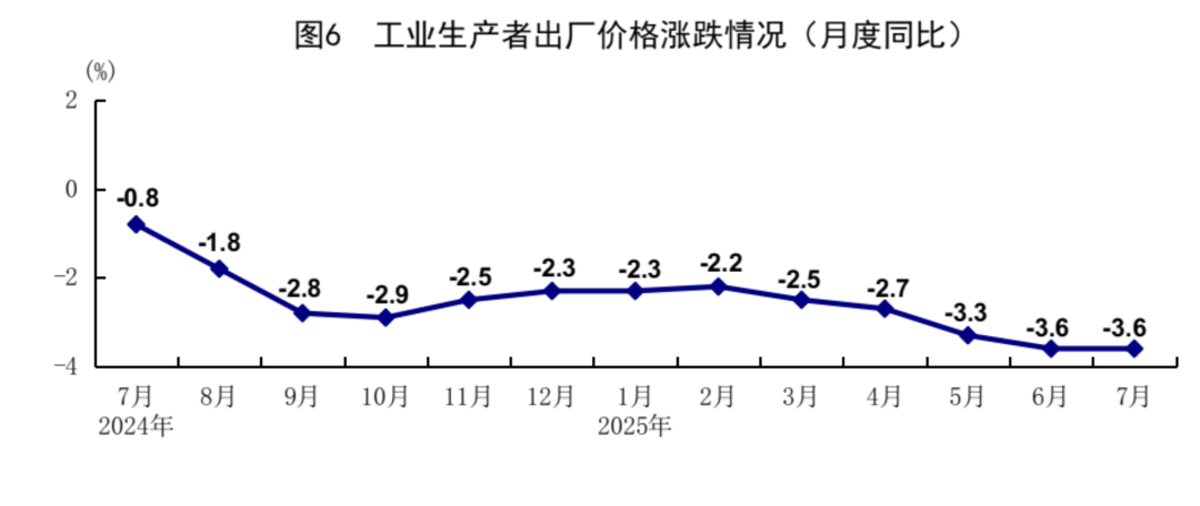 ◆ 7月份,全国工业生产者出厂价格同比下降3.6%,环比下降0.2%;全国工业生产者购进价格同比下降4.5%,环比下降0.3%。1-7月份,全国工业生产者出厂价格和购进价格同比分别下降2.9%、3.2%