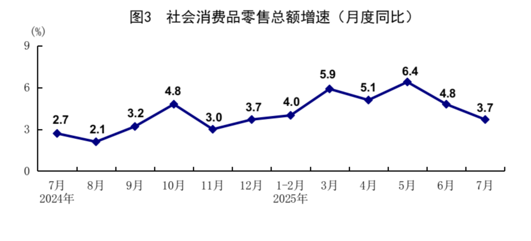 7月份,社会消费品零售总额38780亿元,同比增长3.7%;环比下降0.14%。